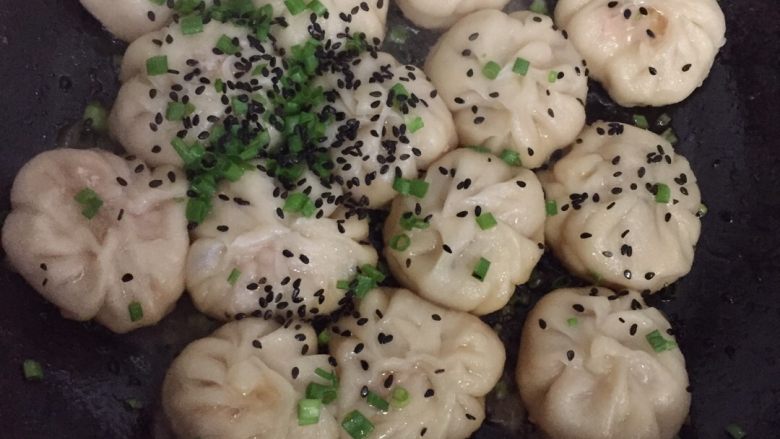 17. 起油锅放入包好的包子 煎至底部金黄时加入漠到包子一半的水盖锅盖 将水煎的蒸发 再放入芝麻和葱 再煎1分钟。起锅~