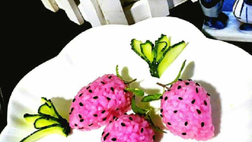 草莓饭团,小宝比较喜欢吃草莓,草莓君貌似无人不爱😂😂😂😂,我们的网厨洋洋也超喜欢😘😘😘看见网厨友友早餐里有草莓,就跟小宝说妈妈给你买草莓吃吧,就和小宝去超市,不料哪天木有卖,看小宝好失望,时间已经挺晚了就没办法去别的地看有没有了,刚好要买青菜就看见了小宝爱吃的苋菜,之前做过苋菜汁弄的食物,灵机一动用这个菜汁弄草莓饭团,然后告诉小宝不要失望妈妈今晚让你吃上草莓饭,小宝说不是没有草莓吗,我说我们可以用菜汁弄,回来小宝一直等着,看他眼神好好奇,饭好了终于开始做了,边做边看😁😁😁,做好了第一个小宝忍不住要吃了,就主要去洗手,直接手抓着吃,连吃了三个,看他好满足直夸,妈妈,妈妈你真棒,妈妈,妈妈你最棒😂😂😂,当妈的看见孩子开心,说实话什么都值得了