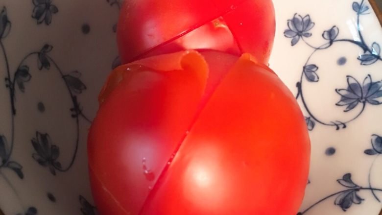 5. 等番茄皮有点上翘或者开裂 即可捞出 剥皮 却成小块