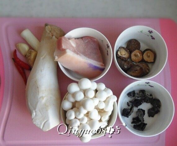 1. 准备:香菇木耳、猪肉、白玉菇杏鲍菇蒜、辣椒等主辅料。