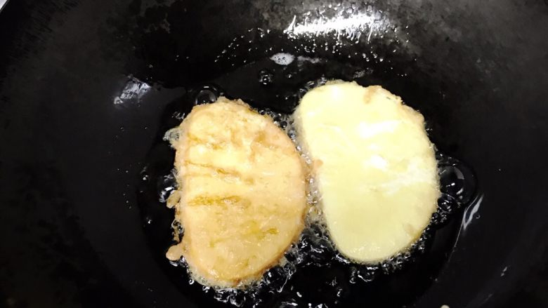 4. 调好的蛋液别忘了放盐喔, 把馒头片浸泡在蛋液内,涂抹均匀后下锅油炸
