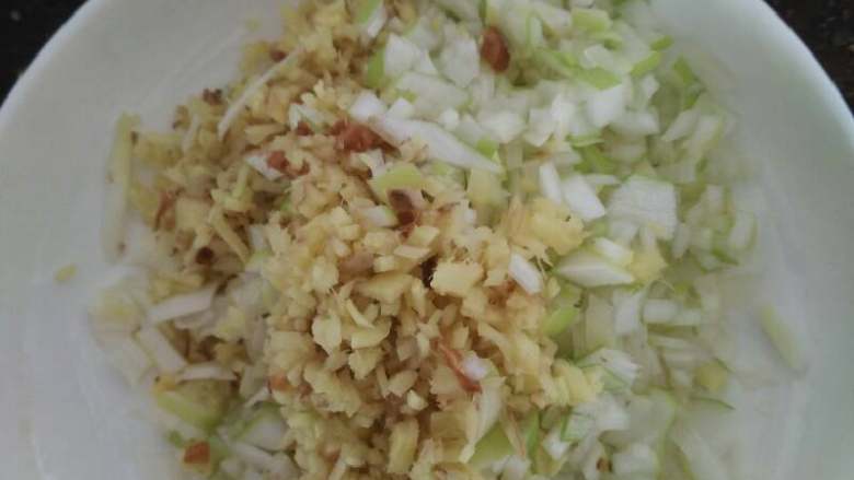 4. 将葱姜末炒至脆黄,下蘑菇炒香,加入老抽,生抽,蚝油,盐,拌馅香料将馅料拌好