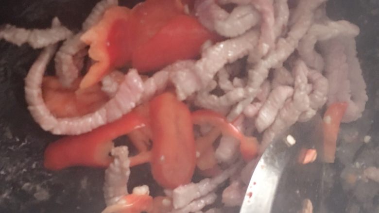 6. 把肉炒一炒,然后放红椒丝,因为牛肉还是嫩点好吃,可以放一点点盐调味。