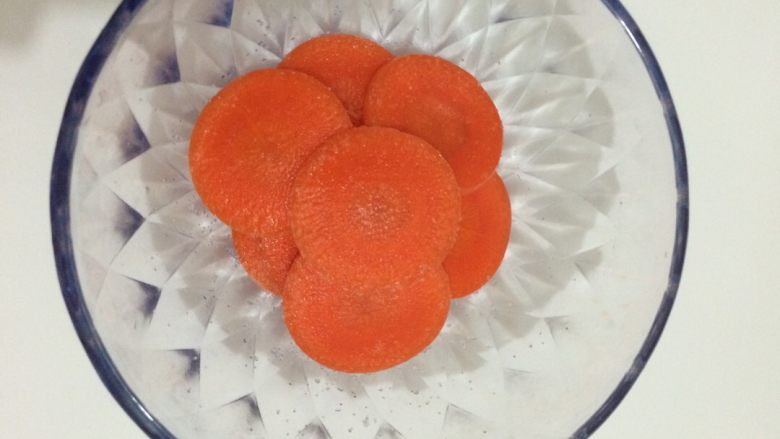 4. 第二片胡萝卜对折,移位插在两根牙签的相邻端,第三四片同样。