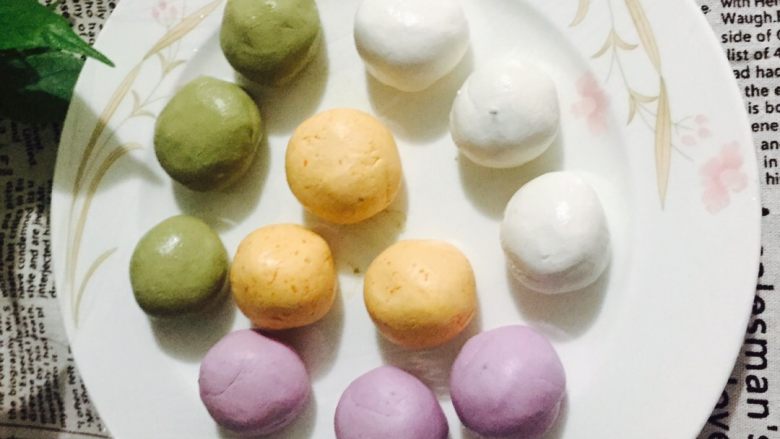 9. 留一些面团做花式汤圆,搓成七个小圆子,一个花心,六个花瓣,用牙签在花瓣里轻轻的压上两个印,就做好了颜色自由搭配。