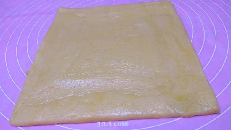 9. 拿油纸剪一张18×18cm的纸,把面团铺在纸上面,用擀面杖擀平。