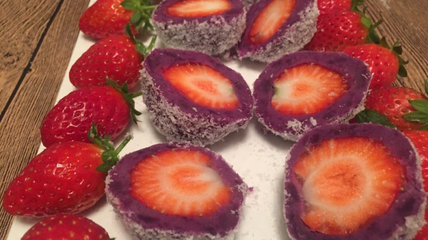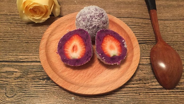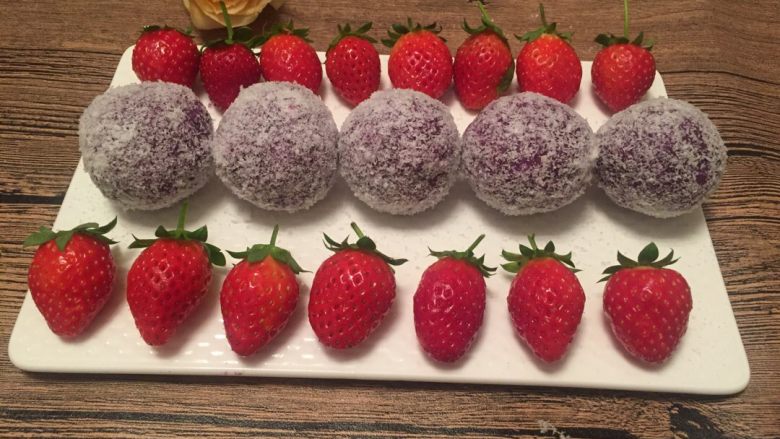 16. 应季水果别错过大好时光,元旦约上亲朋好友,去草莓田转一圈,回来试一试这道「莓芯紫薯球」也是非常不错的。