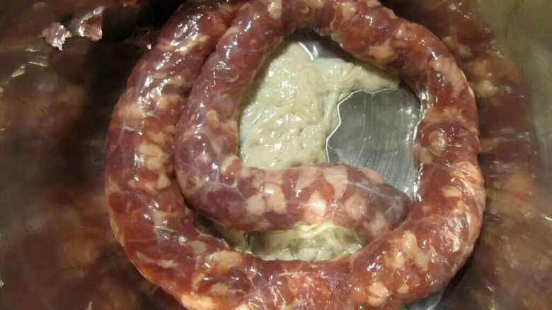 8. 灌好以后用棉绳在中间截断扎好~首尾的肠衣打结。再用针在表面戳孔