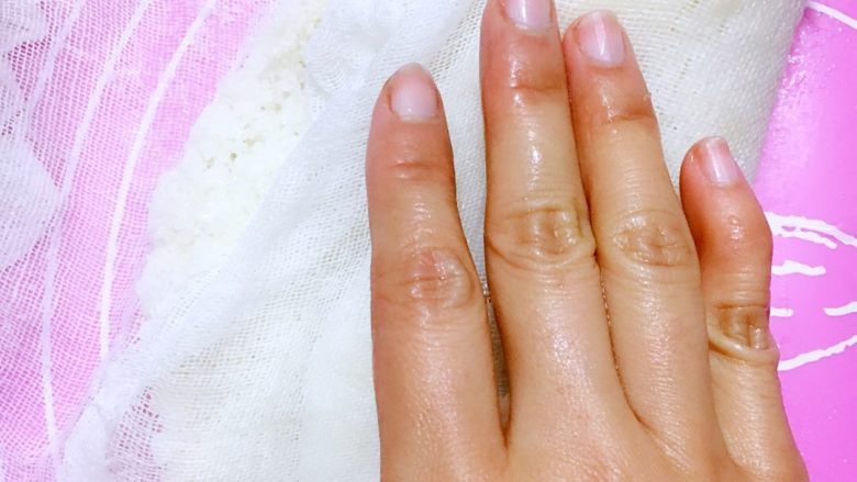9. 手心里沾凉开水,反复地隔纱布按压折叠年糕,直到糖全部洒完,多揉压口感会更糯