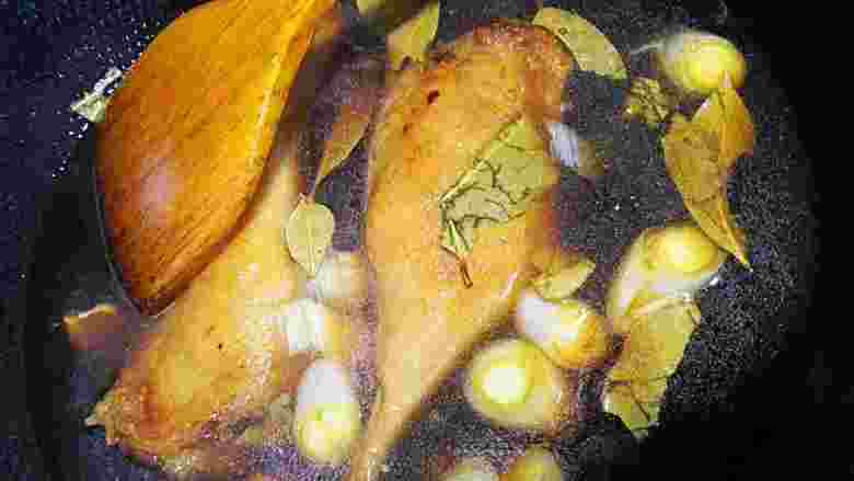 6. 煎好以后加入葱姜蒜八角和香叶翻炒几下, 加入适量冰糖, 再加入适量的料酒, 加入适量生抽,清水,没过鸭腿, 盖盖子小火炖半小时