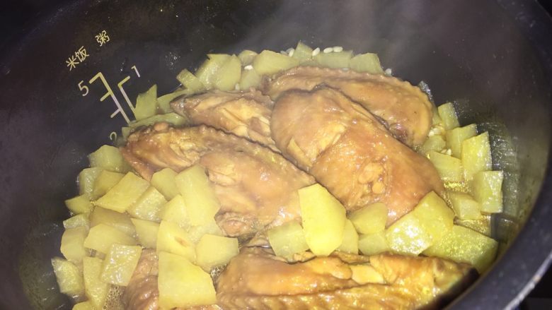 5. 锅开了之后,倒进电饭煲里,如果水过多,适量到处去一点就可以,防止米饭过于软。