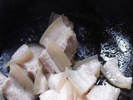4. 冷锅烧热,放入少量的油,放进切好的肉,煸炒出油
