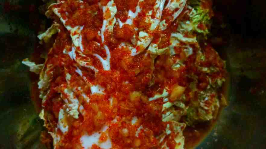 9. 将搅拌好的辣白菜汁均匀的涂抹在白菜上,用保鲜膜封上,放置2-3天,这样一道好吃的辣白菜就做成了,想吃的朋友们可以动手做一下,简单易做。