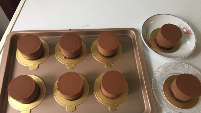 16. 从冰箱取出冷冻成形的蛋糕底,脱模出来备用,因为我想做的高一点,所以就取出来了,如果不想太高,可以不用取出,直接倒入慕斯液