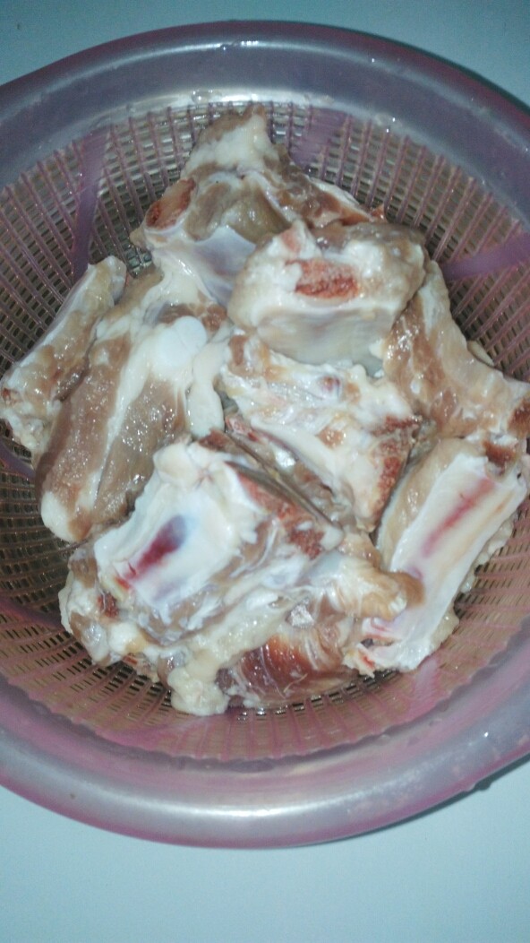4. 排骨浸水,泡去血水,并洗净,焯水,涝出。