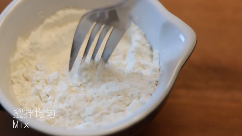 2. 预热烤箱至190度,中筋面粉135g,加泡打粉一汤匙,盐1/3茶匙,搅拌均匀
