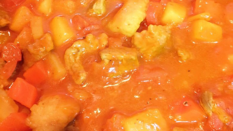 6. 锅中加入冷水,番茄汁,咖喱酱搅拌