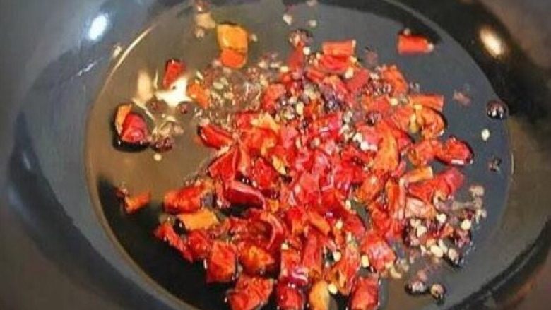 7. 换一只干净的油锅 倒入40毫升左右的食物油 将干辣椒和花椒放入锅中 煸炒至出香味