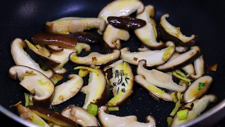 5. 接着放入香菇,略微煸炒出香味。