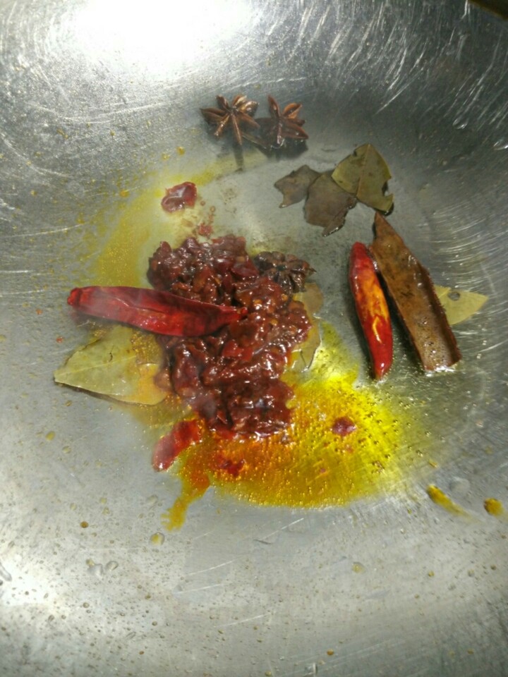 6. 热锅凉油,把干辣椒等大料放下去炒出香味