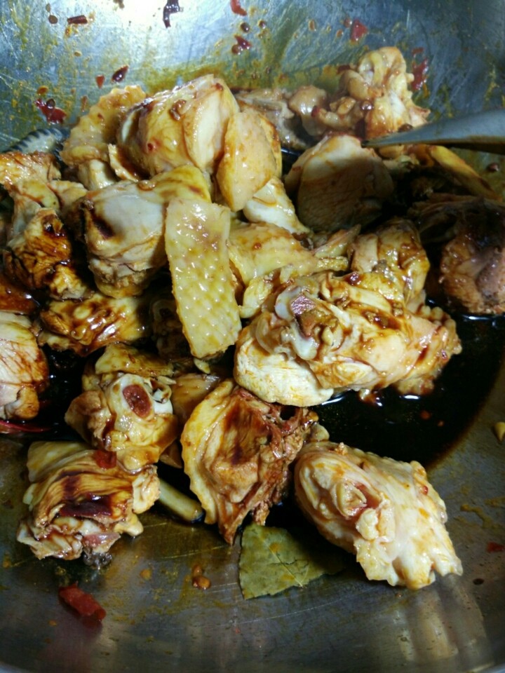 9. 倒入鸡块快速翻炒,让每块鸡肉都沾上酱料
