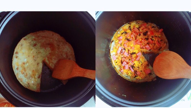 12. 在馅饼上均匀的抹一层蜂蜜柚子。 再次将植物油抹在内胆底部,油热后,放入蛋黄,做成蛋饼后盛出。 再抹一层油(不要太多哟),放入抹好酱的馅饼,将蛋饼平铺在馅饼表面,随后依次铺入火腿丁,海苔碎与肉松 搅匀准备好的鸡蛋,铺洒在饼的表面,鸡蛋会顺着边流下去变成蛋饼边,很好看哦,没有洒到的可以手动铺一下。