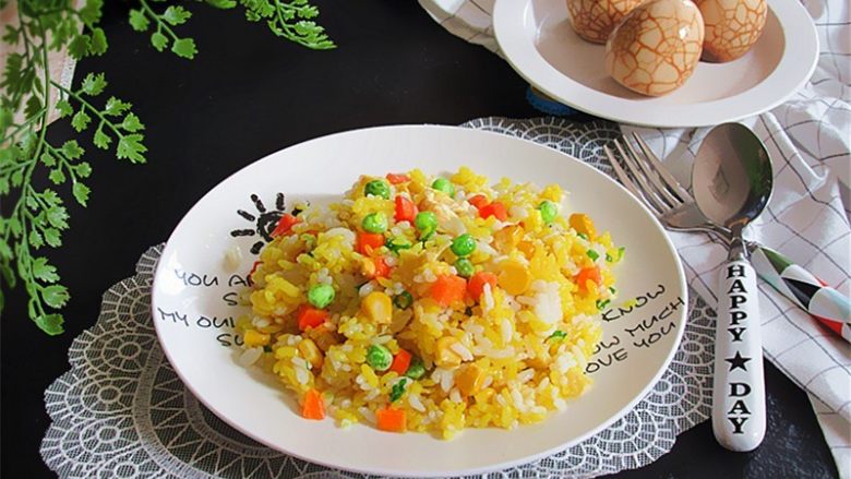 9. 倒入胡萝卜丁、青豆、鸡蛋等
