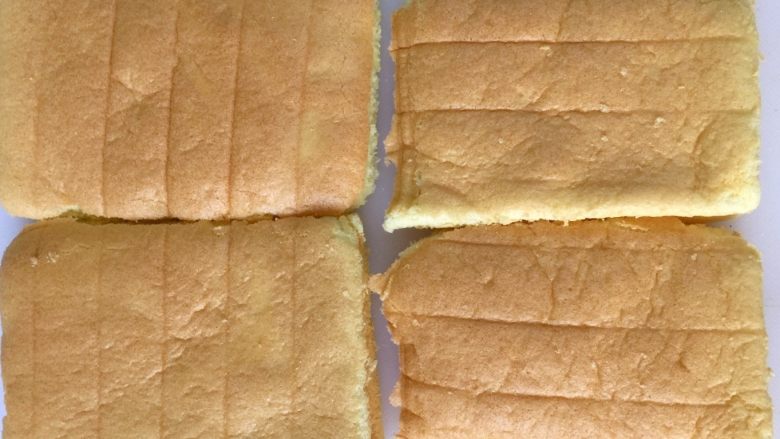 8. 将蛋糕胚切成和便当盒一样大小的蛋糕片,每盒蛋糕一般2片,一盘蛋糕胚大概可以做4盒。