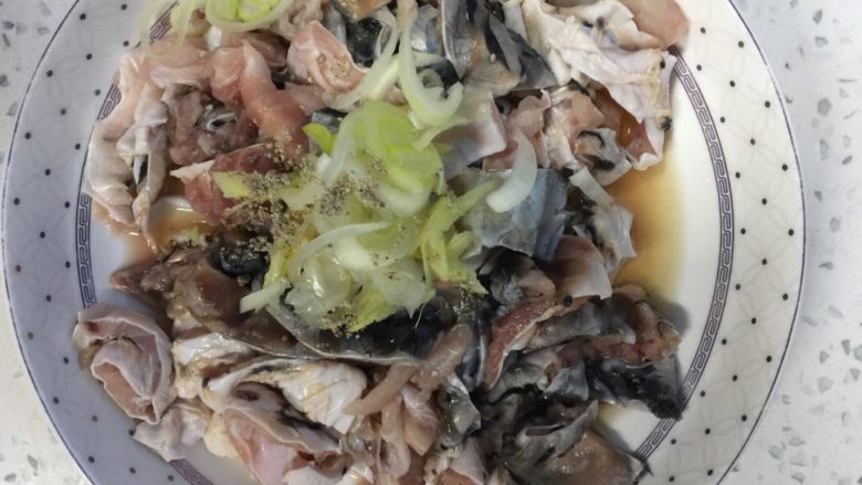 3. 鱼皮用白胡椒,料酒,一半的葱姜腌10分钟
