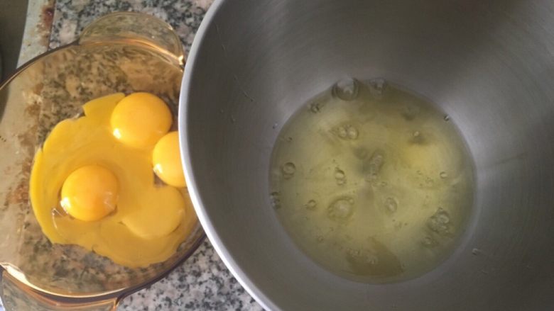 4. 蛋白打发到接近硬性,盛三分之一与蛋黄糊拌匀,然后再把蛋黄糊倒进蛋白里搅拌均匀!不要过度搅拌,要用翻拌的手法以免消泡