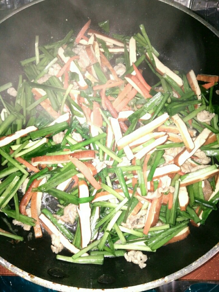 6. 放入豆腐干和胡萝卜,煸炒,加少量温水,加盐,翻炒一会儿,让豆腐干入味。