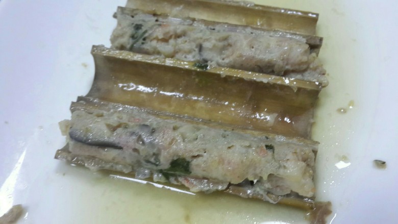 海参,虾仁,螺肉,蘑菇,五花肉馅,香菜等酿在竹筒里整熟