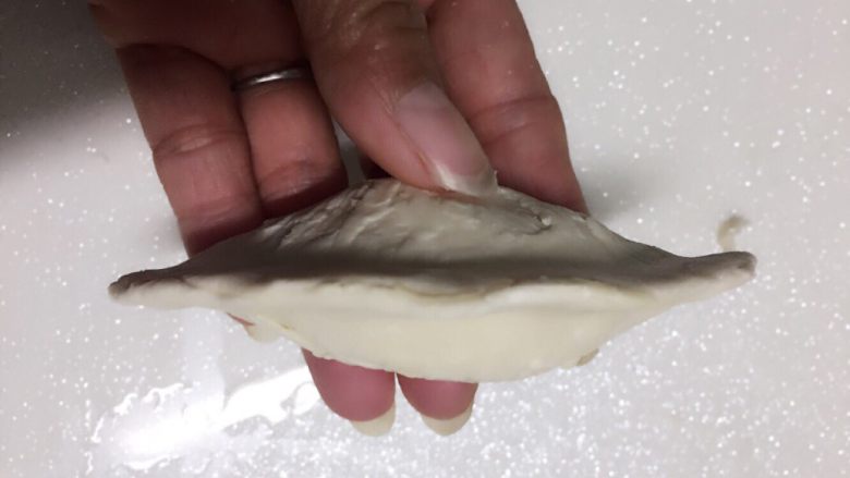 6. 就像包饺子一样,把外皮捏在一起,稍稍薄一点。