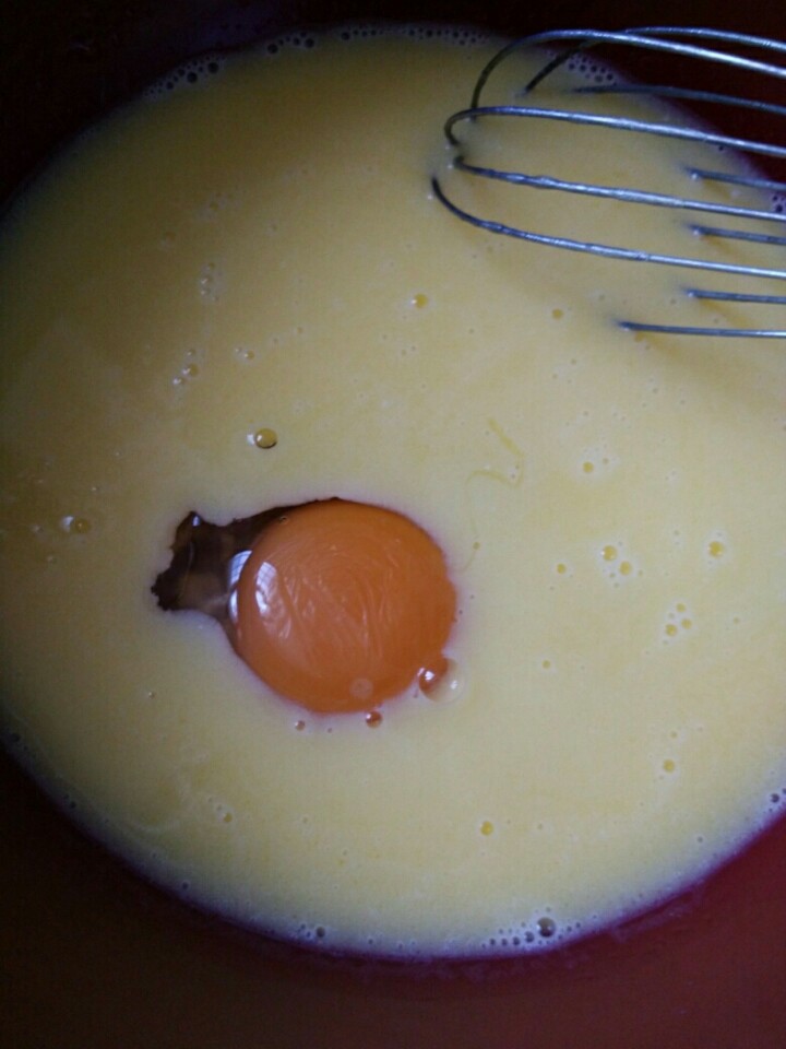 3. 黄油牛奶液体晾至不烫手加入一个鸡蛋搅拌均匀,不烫手就是说用手摸着温温的感觉,并不是说完全晾凉