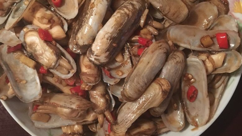 4. 锅热下油放入豆瓣酱炒出味,再加海蛏子翻炒,陆续加小红椒生姜大蒜,加点盐,倒入黄酒!