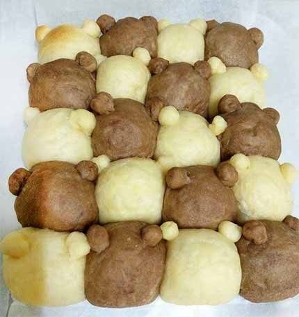 4. 4.将2种颜色的15g的面团分别滚圆,交错排放在铺了烘焙纸的烤盘中, 再将3g的面团分做成2颗小球,用牙签固定当耳朵