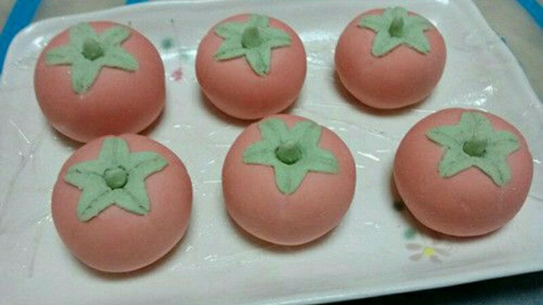 6. 取一块红色面团包入红豆沙馅捏好,揉成丸子用手指在丸子顶端轻压,做成番茄的样子。