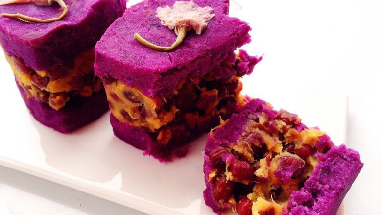 4. 把红豆泥上下分别用紫薯泥夹上就可以啦。表面放上泡好的盐渍樱花,完成…