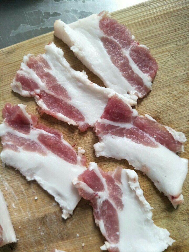 1. 去皮五花肉切片,比一元钱硬币厚一点就行