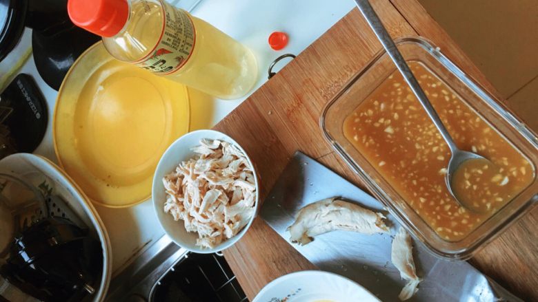 2. 将煮熟的鸡胸肉沥干,切碎蒜末,这里有个小技巧,切蒜不需要剥蒜皮而是用刀背碾压,自然能去皮