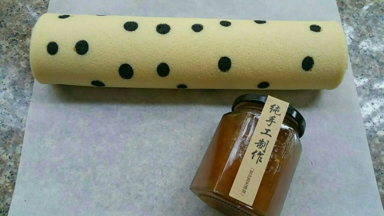 24. 再在蛋糕面放一张油纸,翻转蛋糕,使有波点的面表下,撕去上面的油纸,抹上自制果酱,卷制好放冰箱冷藏30分钟定型