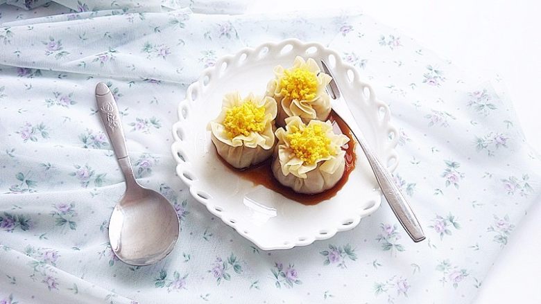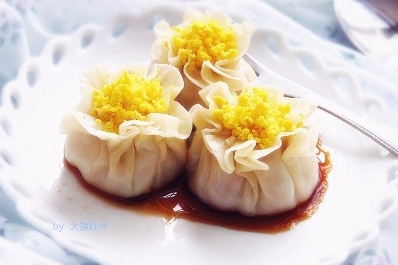 花朵烧卖做法简简单单,在做好的烧卖上留点口,把蛋黄压成茸,撒在上面,即可秒变一朵花,小孩吃应该喜欢。