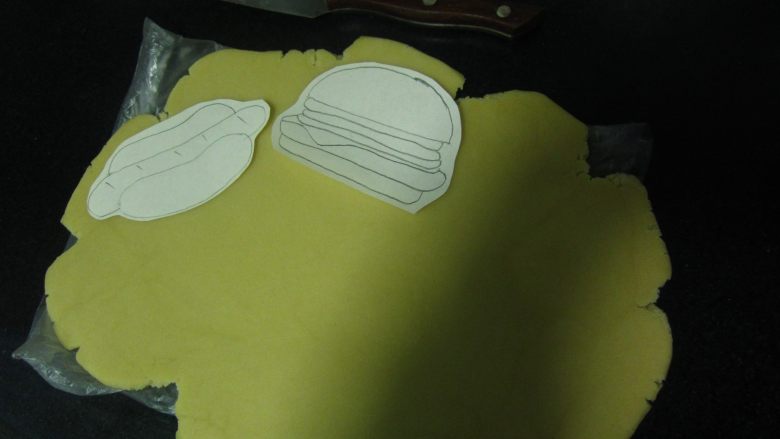 19. 用浅黄色糖霜画出面包部分,并用深绿色糖霜画出汉堡包的绿色酱汁
