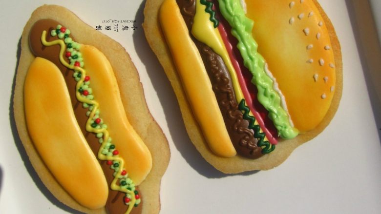 23. 刷好色后用白色糖霜在汉堡包面包上挤出芝麻
