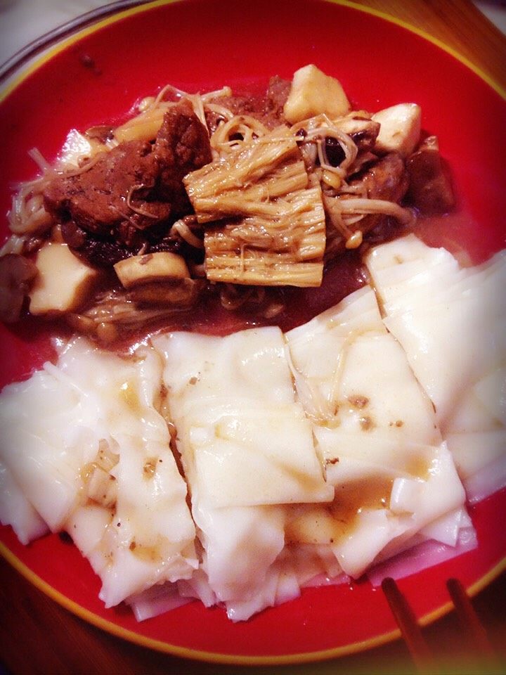 8. 面上面淋上菌菇牛排的汤汁,两者搅拌一下,开吃