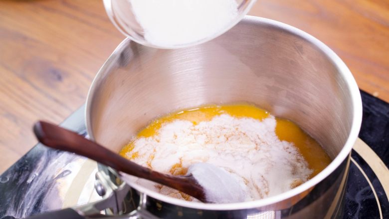 7. 用小火将芒果泥略微加热,芒果泥里加入吉利丁粉20g,并不停搅拌使吉利丁粉均匀的溶解。加热到50度左右即可,不要煮沸。吉利丁粉溶解之后,将芒果