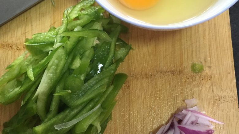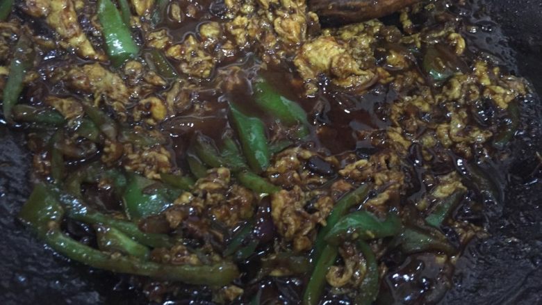 7. 油热后入鸡蛋炒均匀加青椒和洋葱翻炒均匀加黄豆酱加一点水翻炒均匀即可