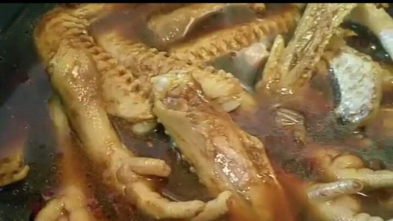 4. 炒香大料后(约2分钟) 再放入鸭翅和鸡爪翻炒