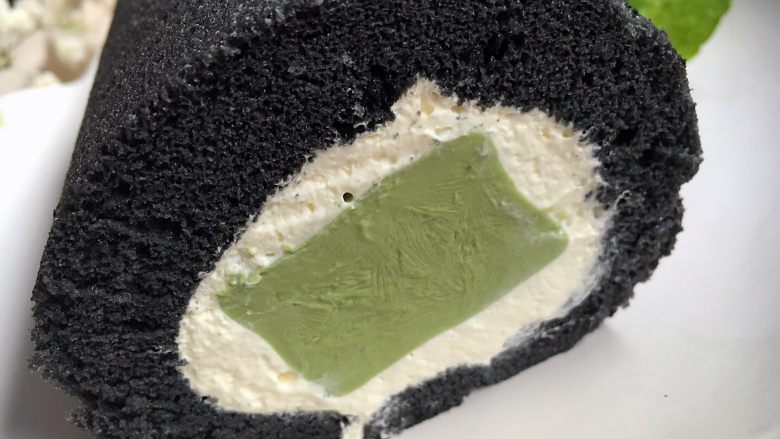 竹炭粉打开一包,就又要想着怎么来消耗掉了,卷个蛋糕卷也是不错的选择,黑白配加抹绿。