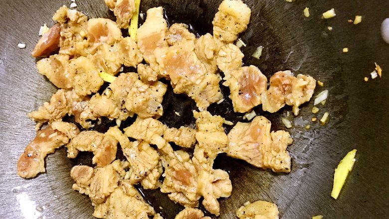 8. 蒜末生姜爆香后放入腌制好的肉翻炒